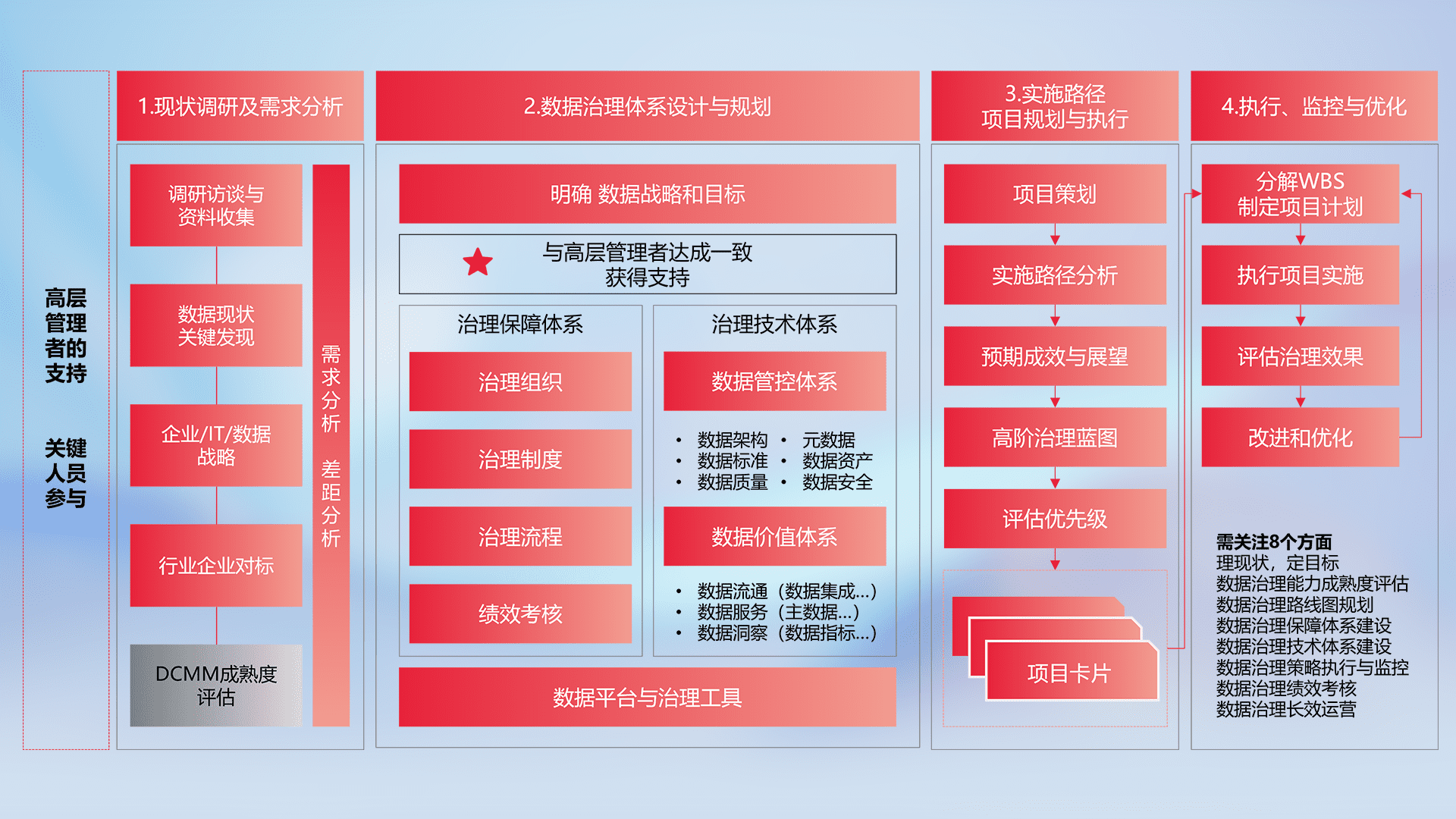 制定并执行统一的数据标准,,,,规范数据定义和格式,,,消除冗余和不一致性,,实现跨部门和跨系统的数据一致性,,,为企业提供标准化的数据基础。。
